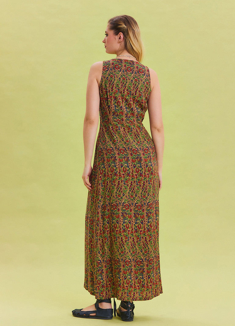 Maxi boyu ve ferah kesimi sayesinde gün boyu rahatlık sunan bu elbise, sıcak günlerde bile serin kalmanızı sağlar. Canlı yeşil rengi ve özenle işlenmiş deseni ile her ortamda fark yaratır.