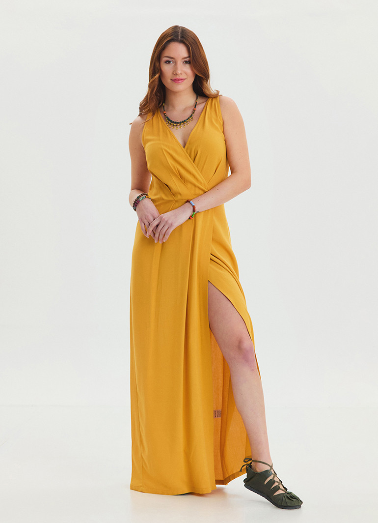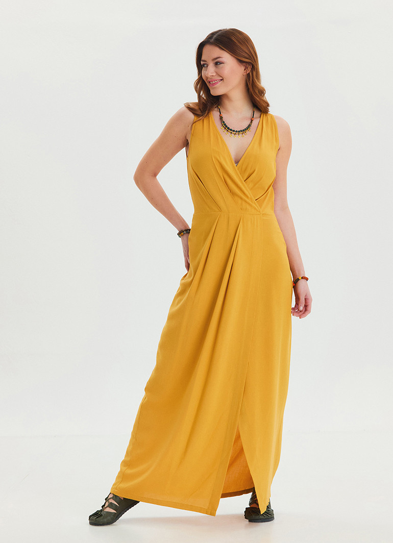 Maxi boy kesimi, V yaka ve özenle işlenmiş yırtmaç detayları sayesinde feminen ve çekici bir silüet elde edersiniz. Canlı sarı rengi, günlük kullanımda ve özel davetlerde fark yaratır.