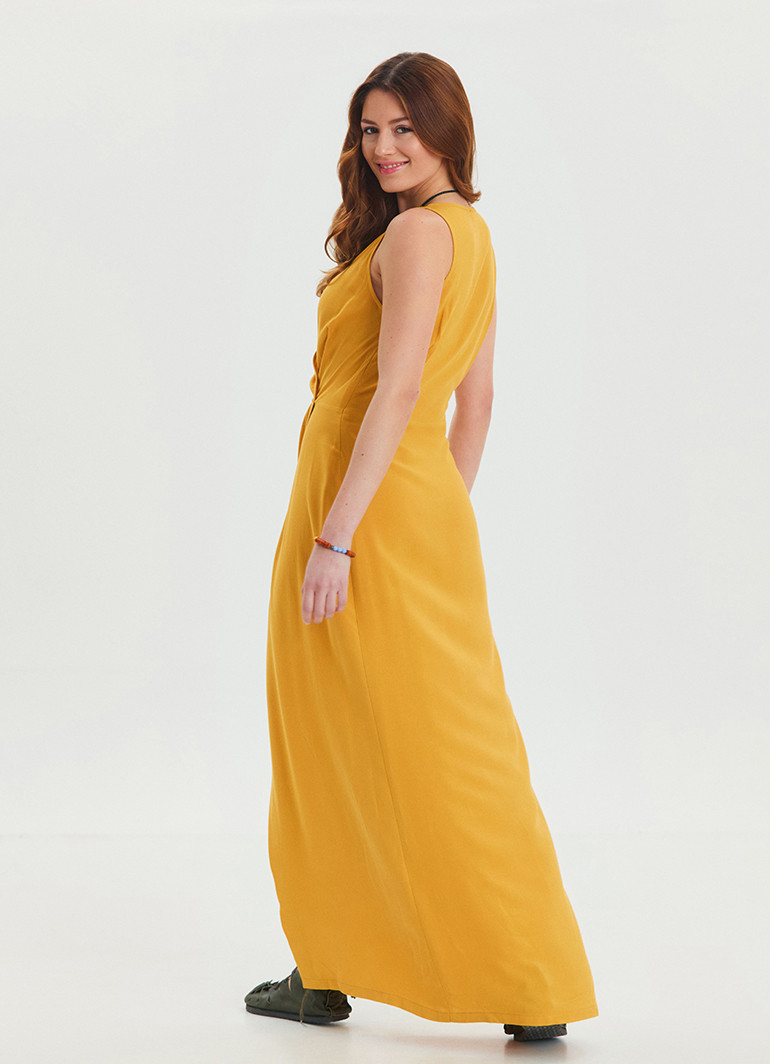 V Yaka Yırtmaç Detaylı Sarı Uzun Elbise 6772, modern ve zarif tasarımı ile yaz aylarında stilinize enerji katıyor.