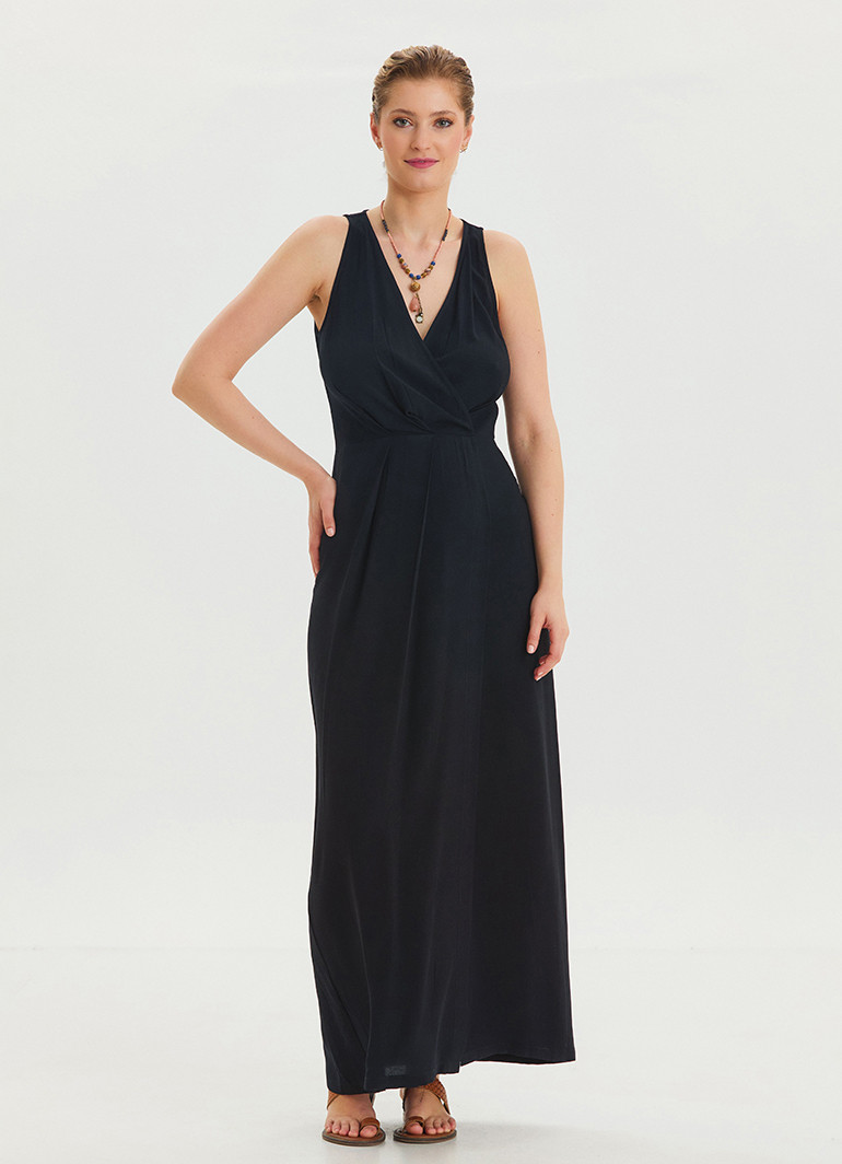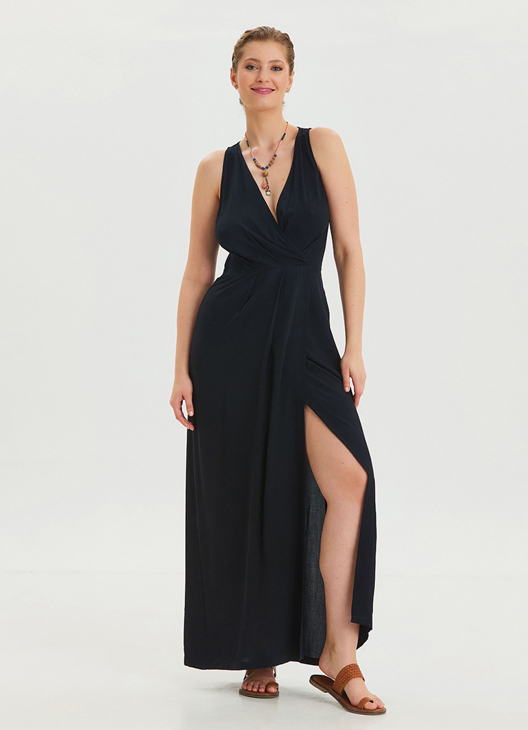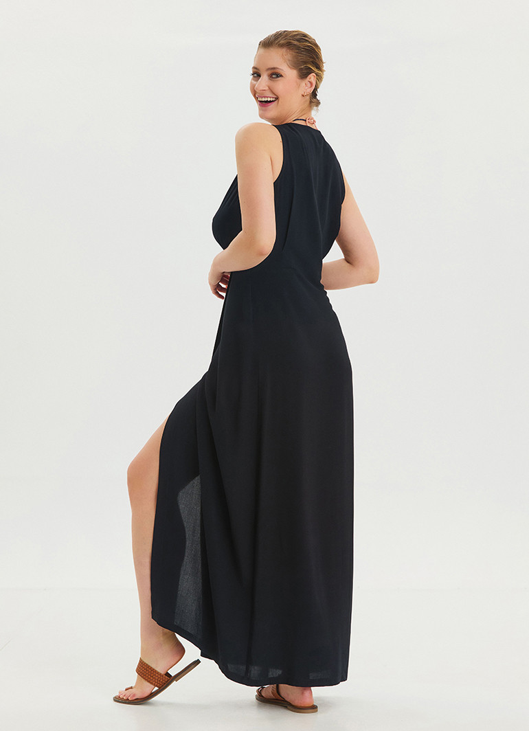 Maxi boy kesimi, V yaka tasarımı ve özenle işlenmiş yırtmaç detayı, vücudunuzu saran kusursuz bir uyum sağlar. Siyahın asilliğini modern detaylarla buluşturan bu elbise, hem günlük kombinlerde hem de özel davetlerde dikkat çekmenizi sağlar.