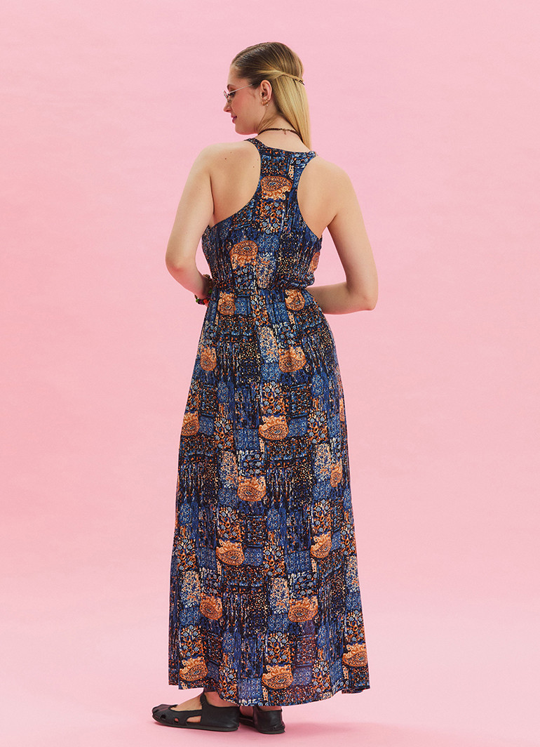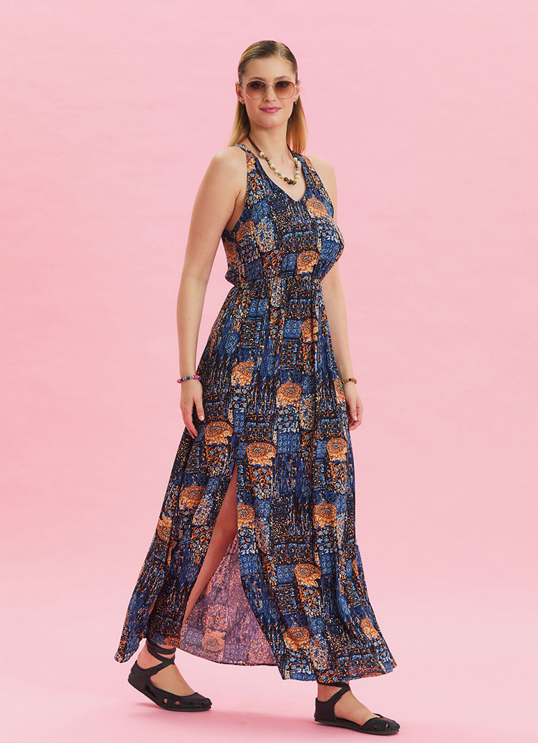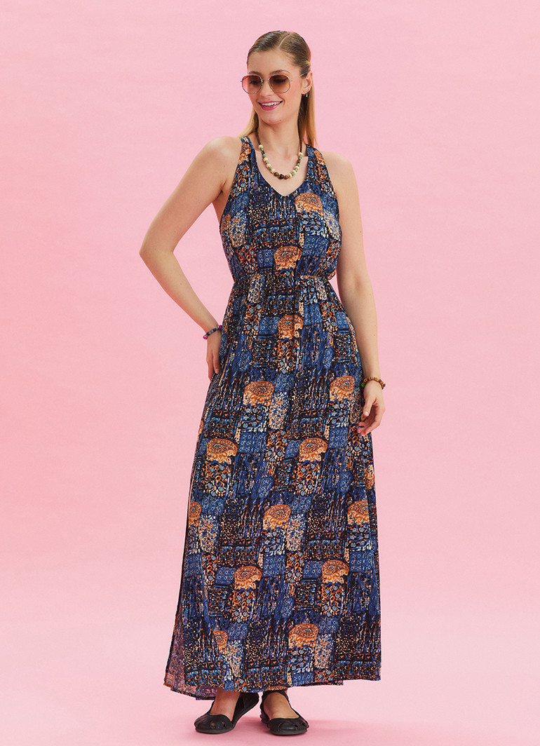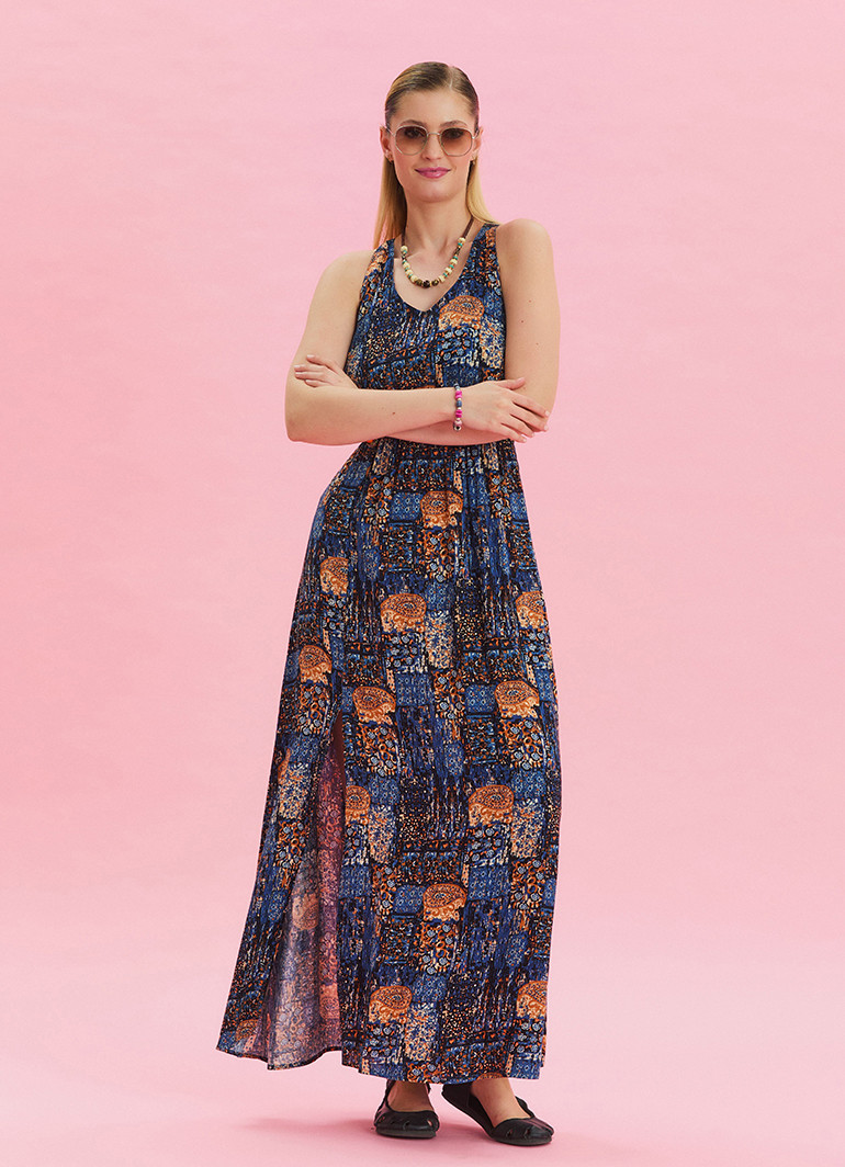 V yaka detayı ve yırtmaçlı kesimiyle dikkat çeken bu mavi çiçek desenli yazlık elbise, yaz aylarının enerjisini gardırobunuza taşıyor.