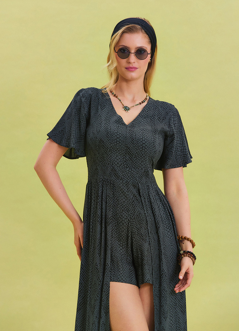 Yazın sıcak günlerinde rahatlık ve şıklığı bir arada sunan Volan Kollu Şort Detaylı Antrasit Kadın Tulum 6807, modern kesimi ve özgün detaylarıyla öne çıkıyor.