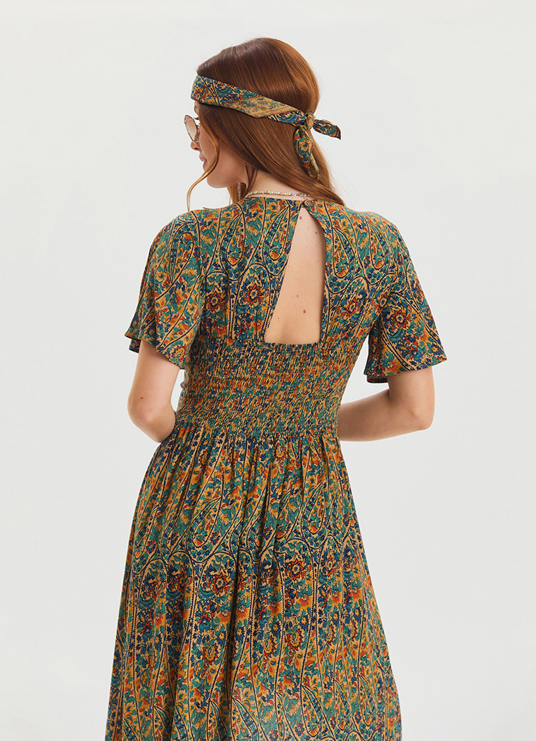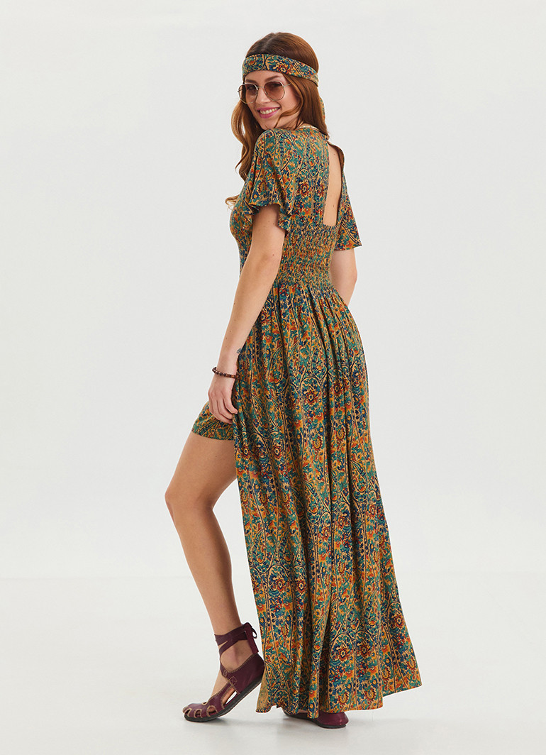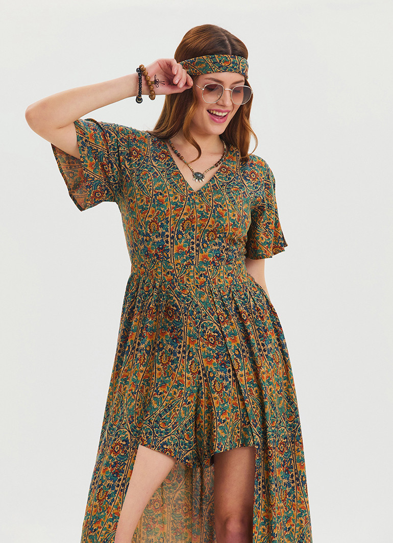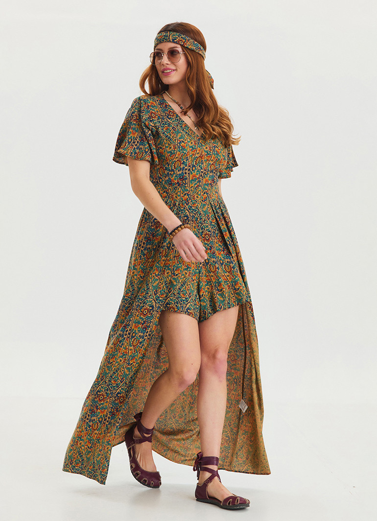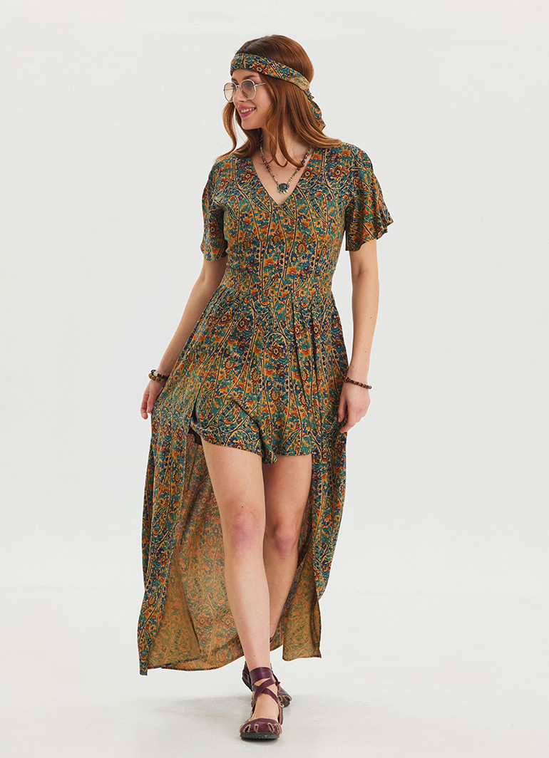 Volan Kollu Şort Detaylı Petrol Kadın Bohem Tulum 6806, modern bohem stilini yansıtan ve yaz aylarına özel tasarımıyla öne çıkan bir parçadır. Şık volan detayları ve V yaka kesimi, feminen zarafeti ortaya koyar.