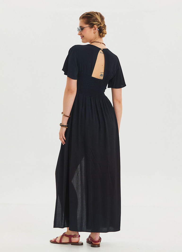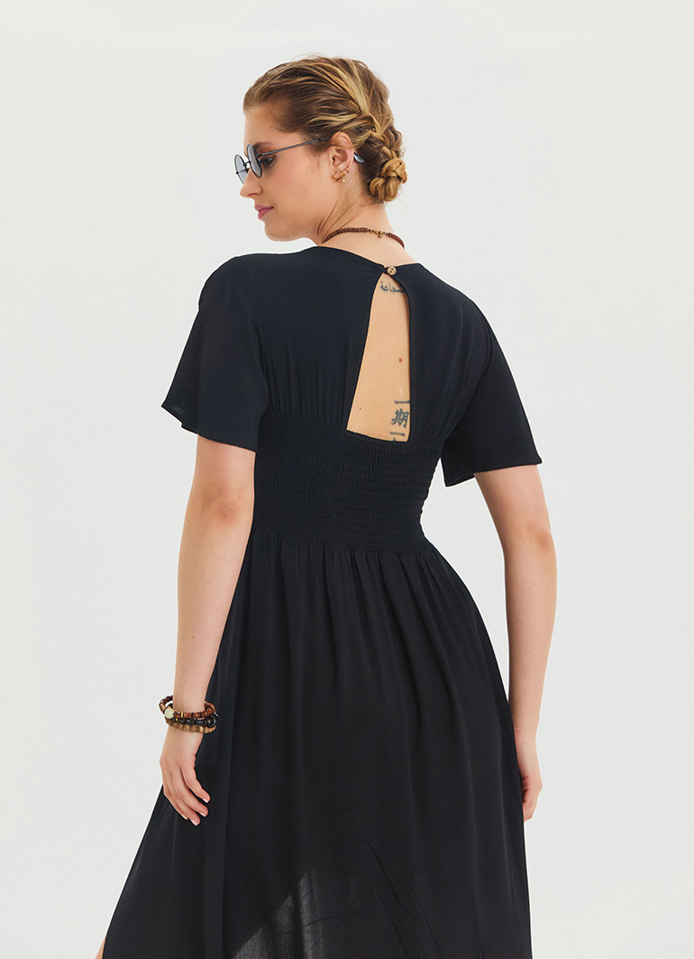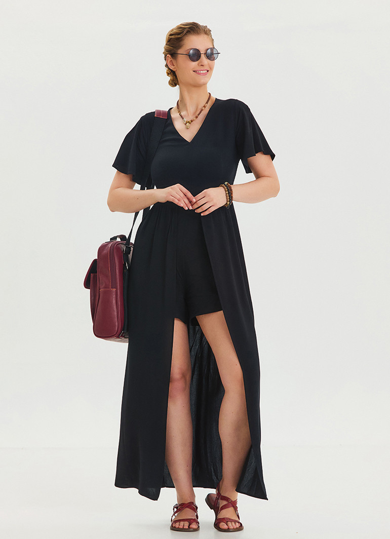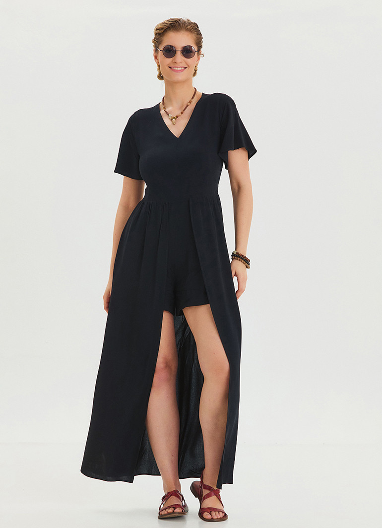 Volan Kollu Şort Detaylı Siyah Kadın Tulum 6809, modern tasarımı ve eşsiz detayları ile yaz aylarının favorisi olmaya aday. Şık volan detayları, rahat şort kesimi ve V yaka stili ile feminen zarafeti ön plana çıkarır.