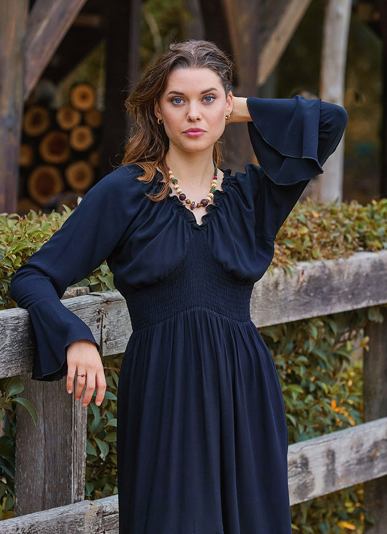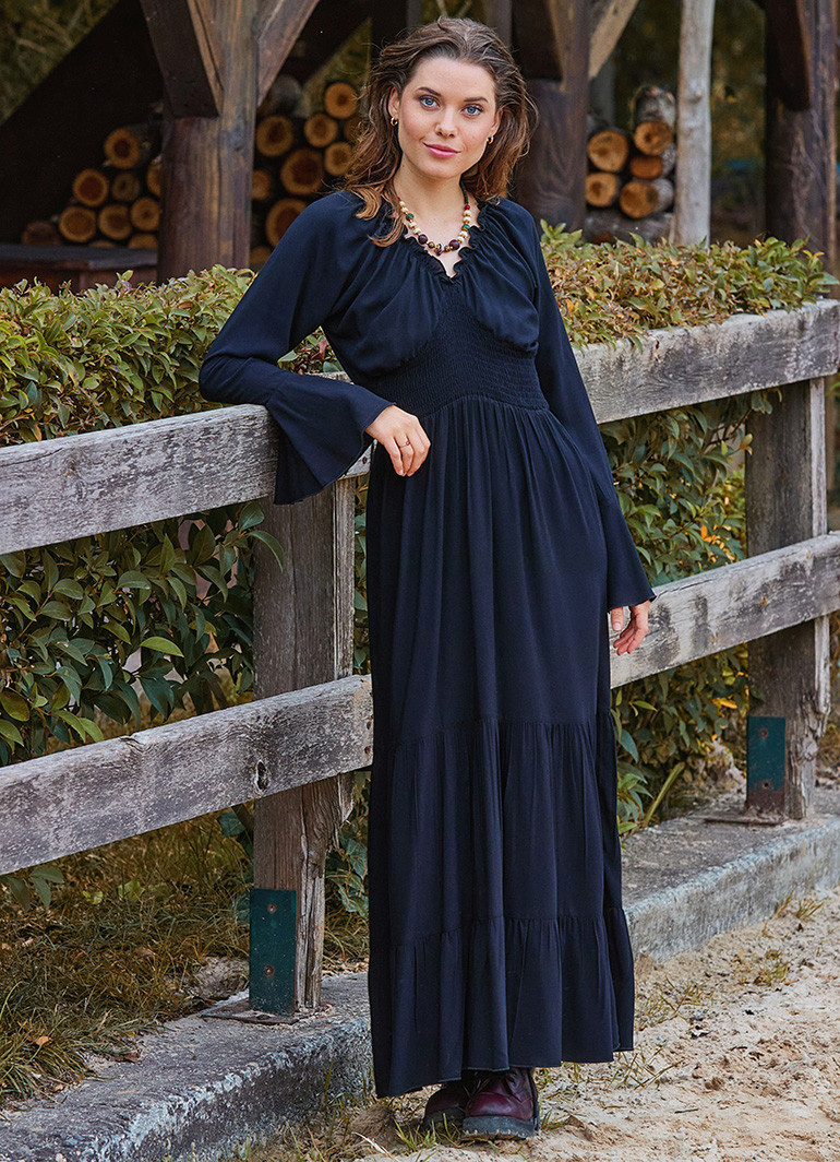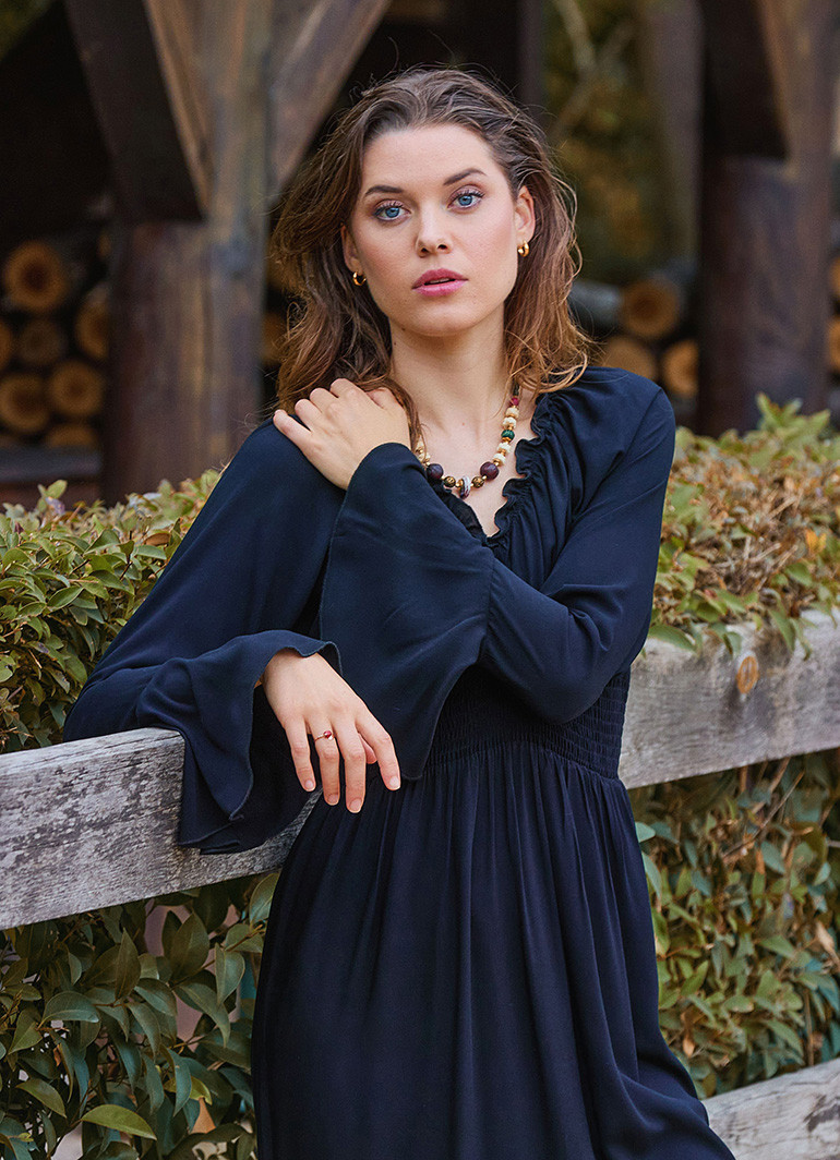 Şıklığı ve konforu bir arada sunan Yakası Lastikli İspanyol Kol Siyah Kışlık Elbise 7045, kış aylarında gardırobunuzun vazgeçilmezi olacak. V yaka tasarımı ve gipe detayları ile zarafeti ön plana çıkarırken, uzun ispanyol kolları sofistike bir görünüm sağlar.