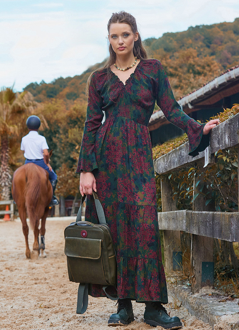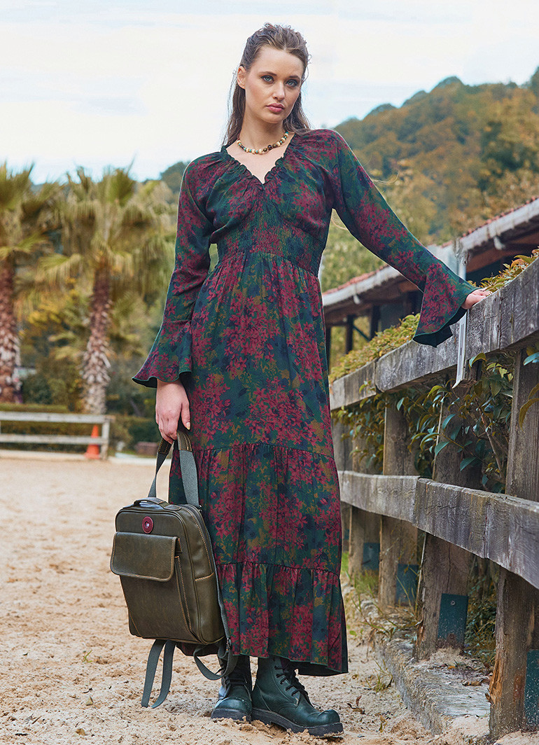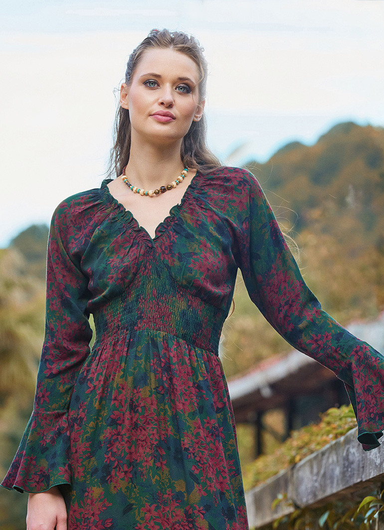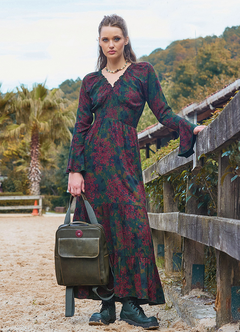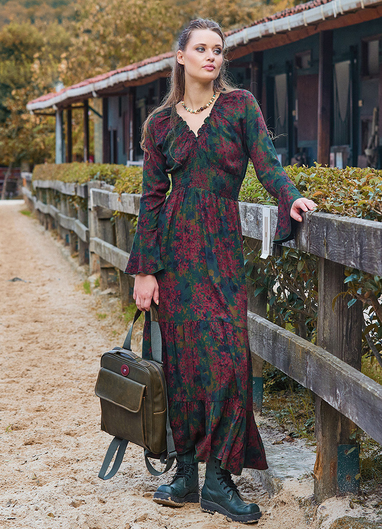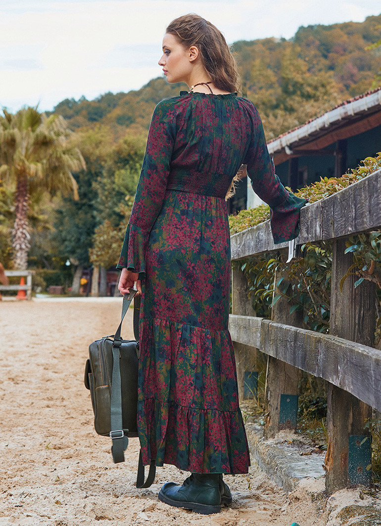 Hakim Yaka Düğme Detaylı Bağlamalı Petrol Çiçekli Elbise 7054