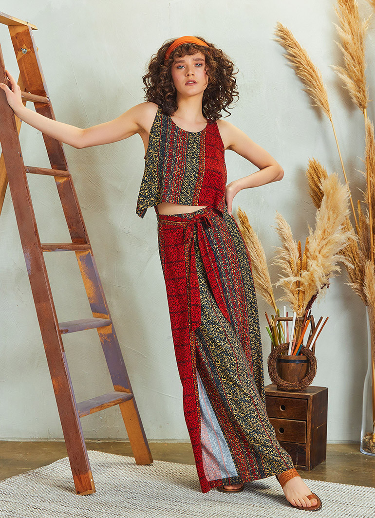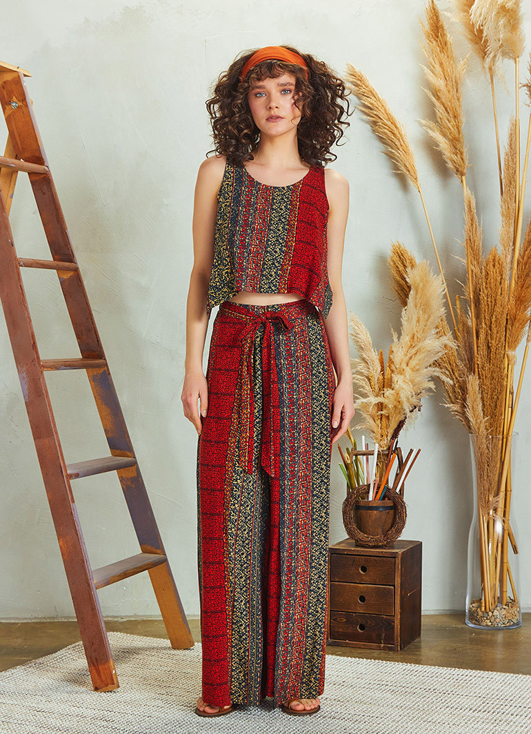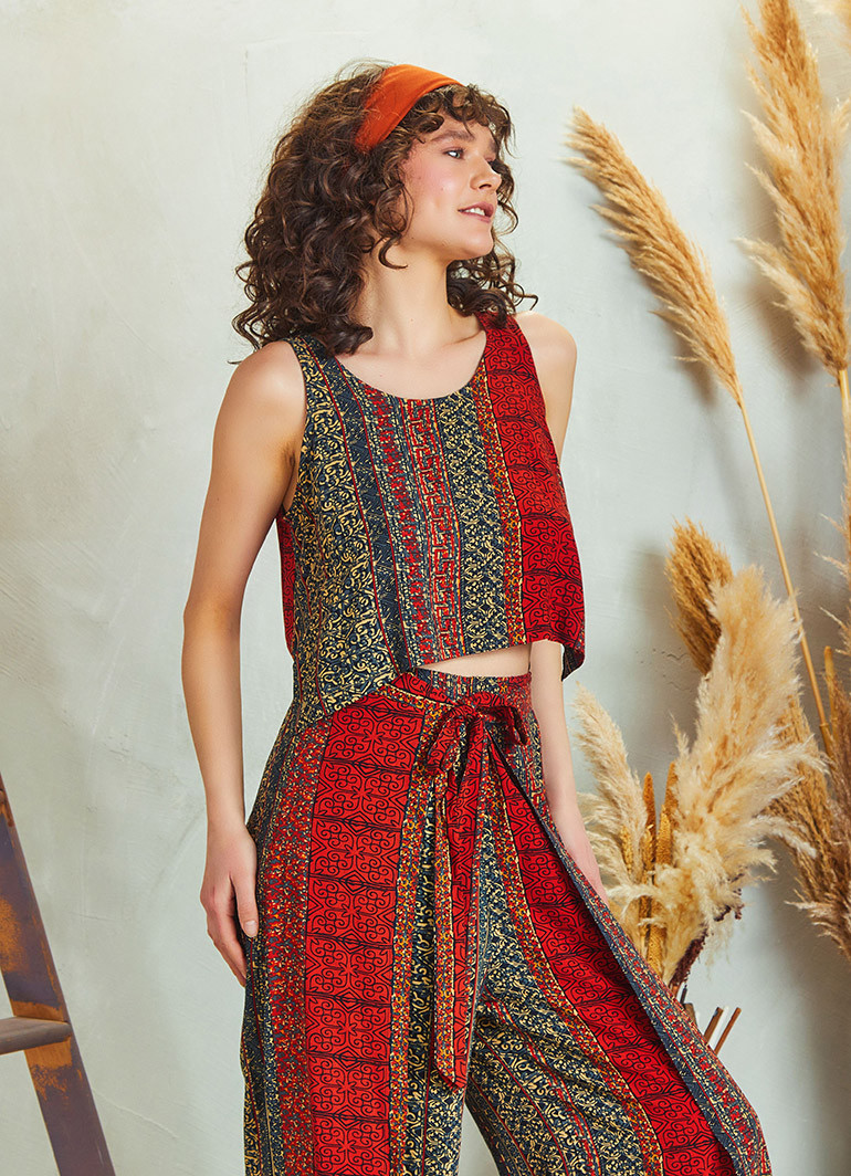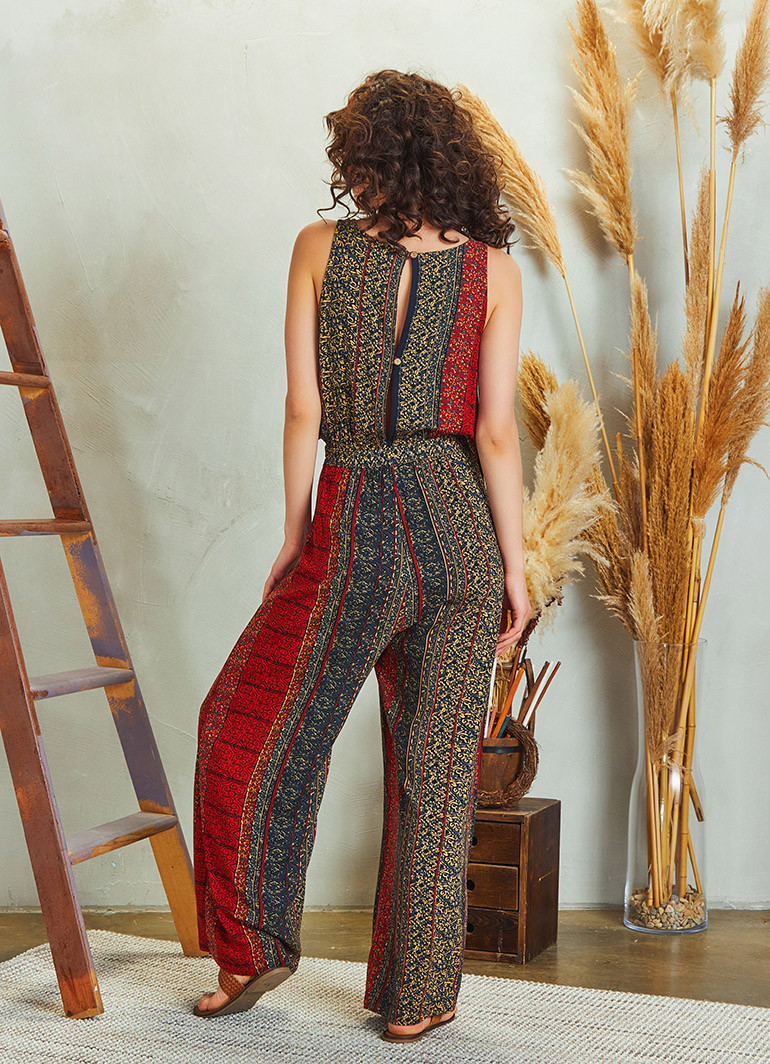 Etnik Desenli, Bohem Tarz, Kayık Yaka, Düğmeli Sırt Dekoltesi, Beli Lastikli, Kuşak ve Kapak Detaylı, Bol Paça, Otantik Kadın Tulum Elbise