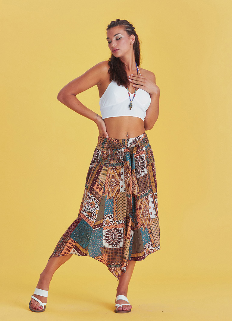 Şıklığı ve rahatlığı bir arada sunan bu petrol desenli salaş kloş etek, modern kadının gardırobuna güçlü bir dokunuş katıyor. Beli bağlamalı formu ile kişisel stilinize uyum sağlar, etnik desenleriyle karakteristik bir duruş sergiler.