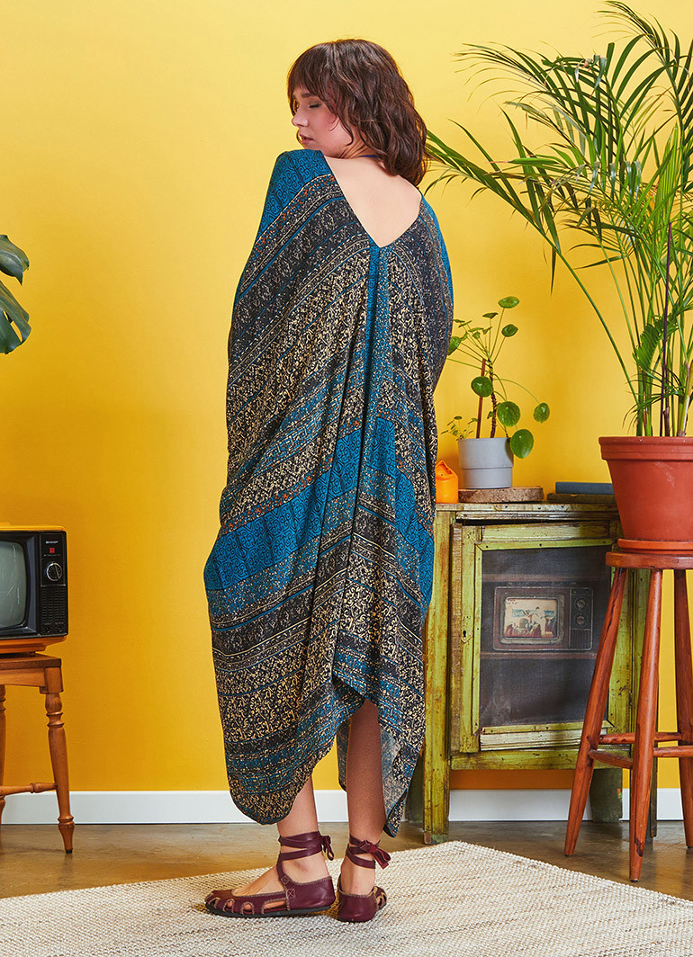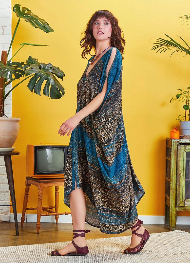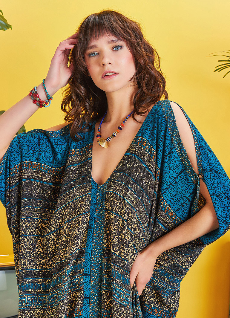 Etnik Desenli, Bohem Tarz, Kayık Yaka, Omzu Açık, Sırt Dekolteli, Otantik Kadın Yazlık Elbise.
