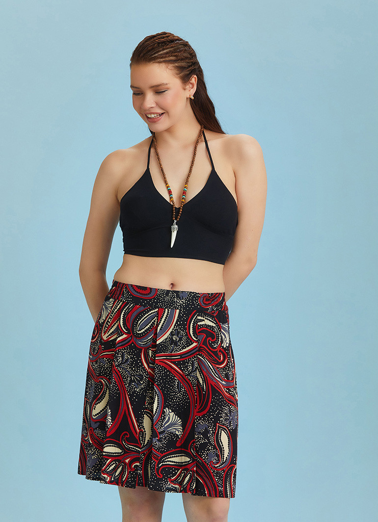 Geniş Pile Detaylı, Arka Bel Lastikli, Cepli, Desenli, Kısa Yazlık Etek