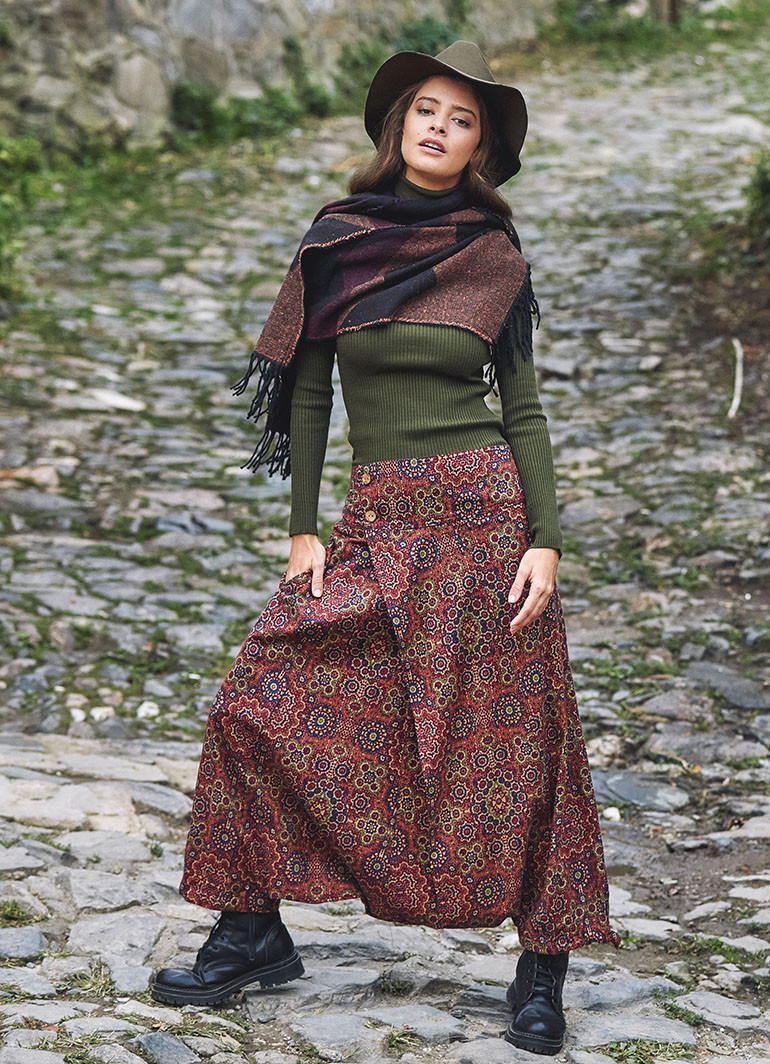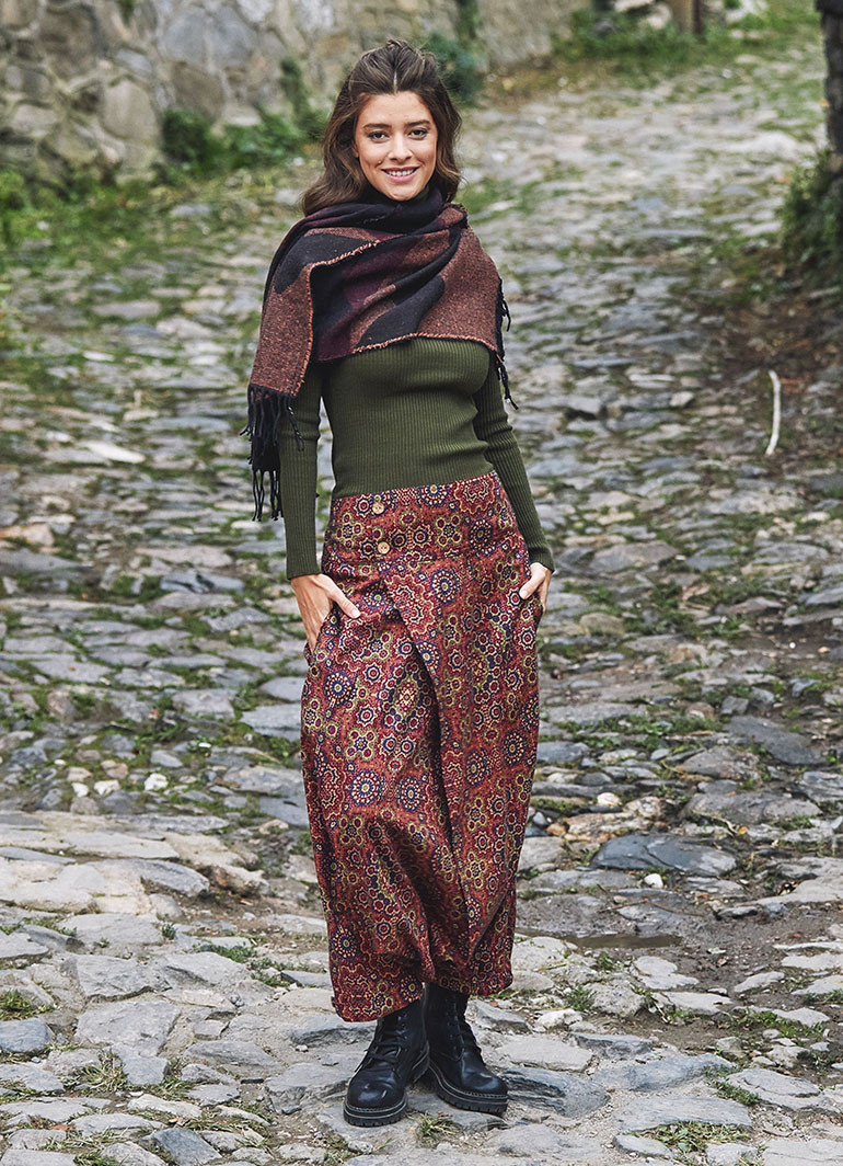Doğal Düğme Detaylı, Cepli, Çiçekli Şalvar Pantolon