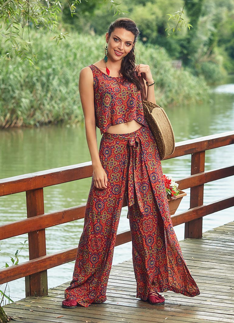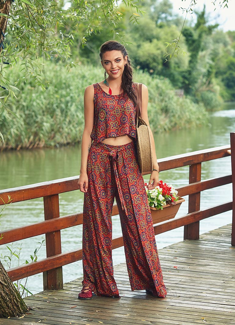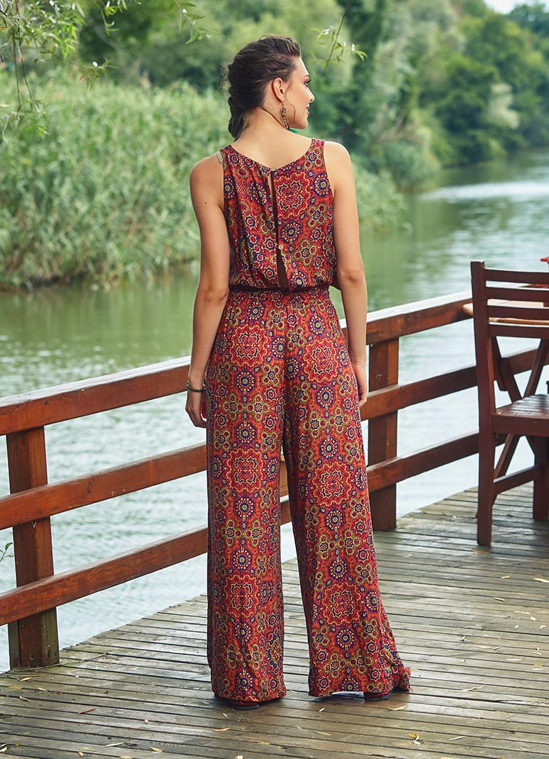 Etnik Desenli, Bohem Tarz, Kayık Yaka, Düğmeli Sırt Dekoltesi, Beli Lastikli, Kuşak ve Kapak Detaylı, Bol Paça, Otantik Kadın Tulum Elbise