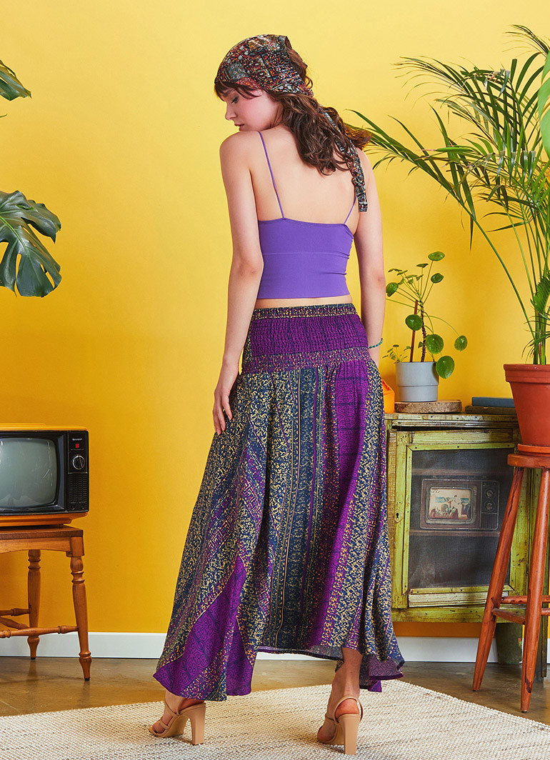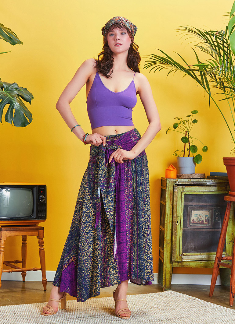 Moda ve rahatlığı bir arada yaşamak isteyen kadınlar için tasarlanan Salaş Mor Desenli Asimetrik Etek ile yaz stilinizi tamamlayın.