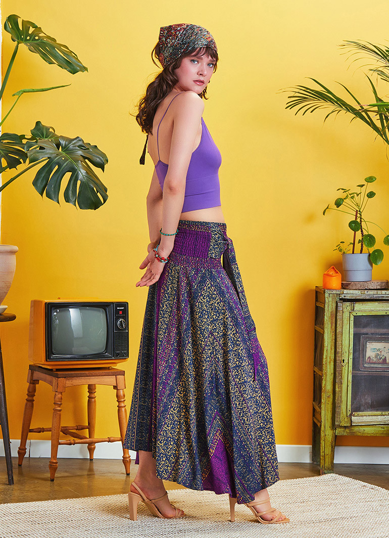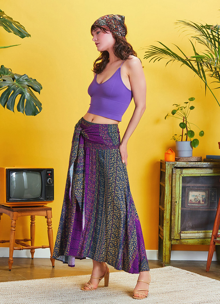 Salaş kesimi ve mor desenleriyle dikkat çeken bu asimetrik etek, yaz gardırobunuzun vazgeçilmezi olmaya aday. Belden bağlamalı yapısı ve gipe detaylarıyla hem şıklığı hem de rahatlığı bir arada sunar. Hafif ve nefes alan %100 dokuma viskon kumaşı sayesinde gün boyu ferah kalmanızı sağlar.