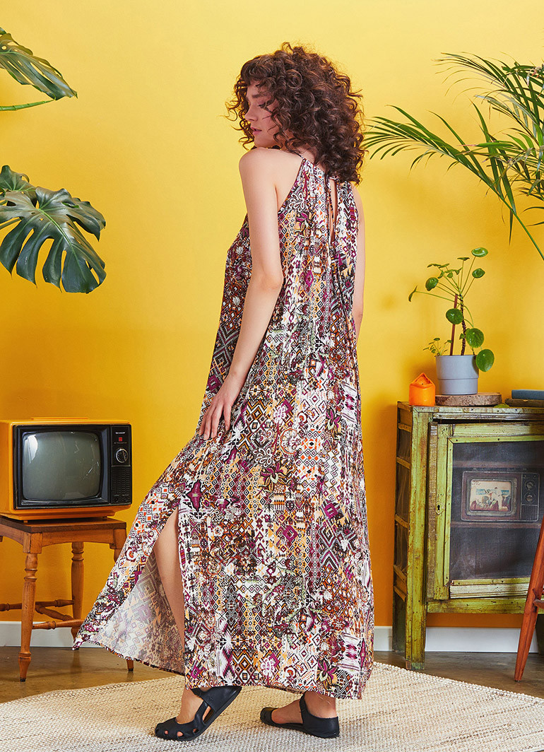 Boyundan Bağlamalı Halter Yaka, Sırt Cut Out Detay, Yanları Yırtmaçlı, Uzun Yazlık Elbise