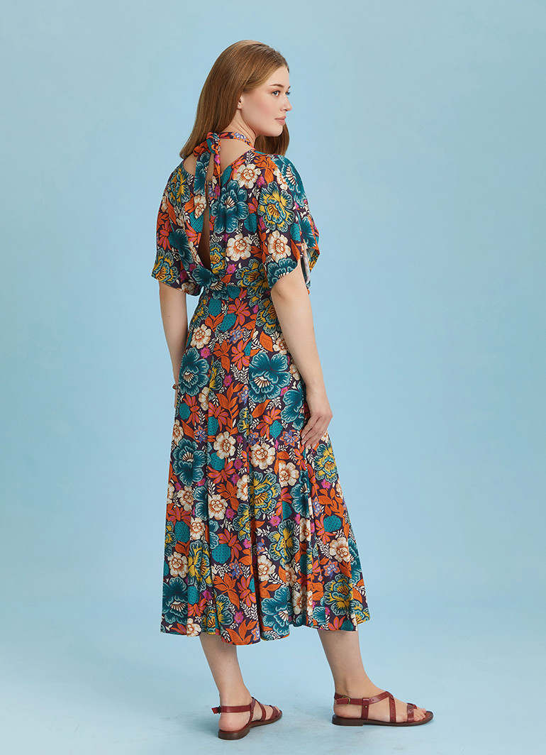 Sırt Pencereli Çiçek Desenli Büyük Beden Bohem Elbise 6476