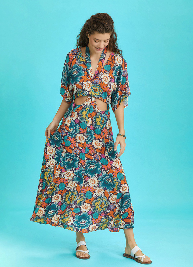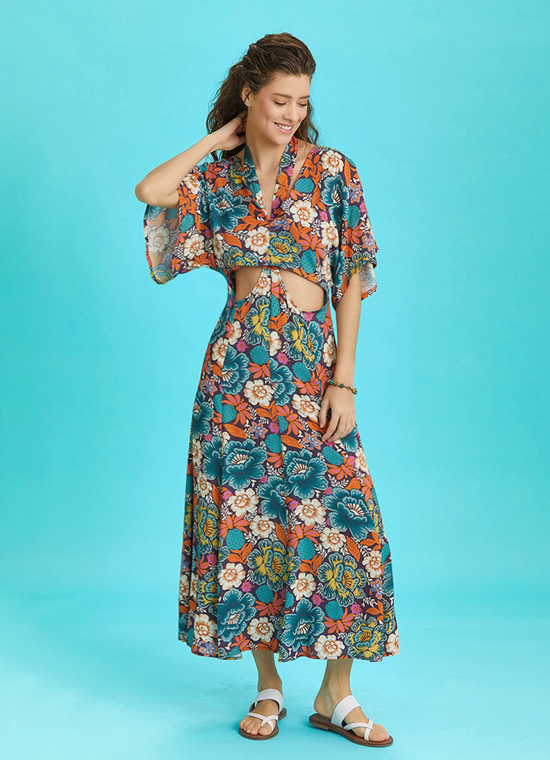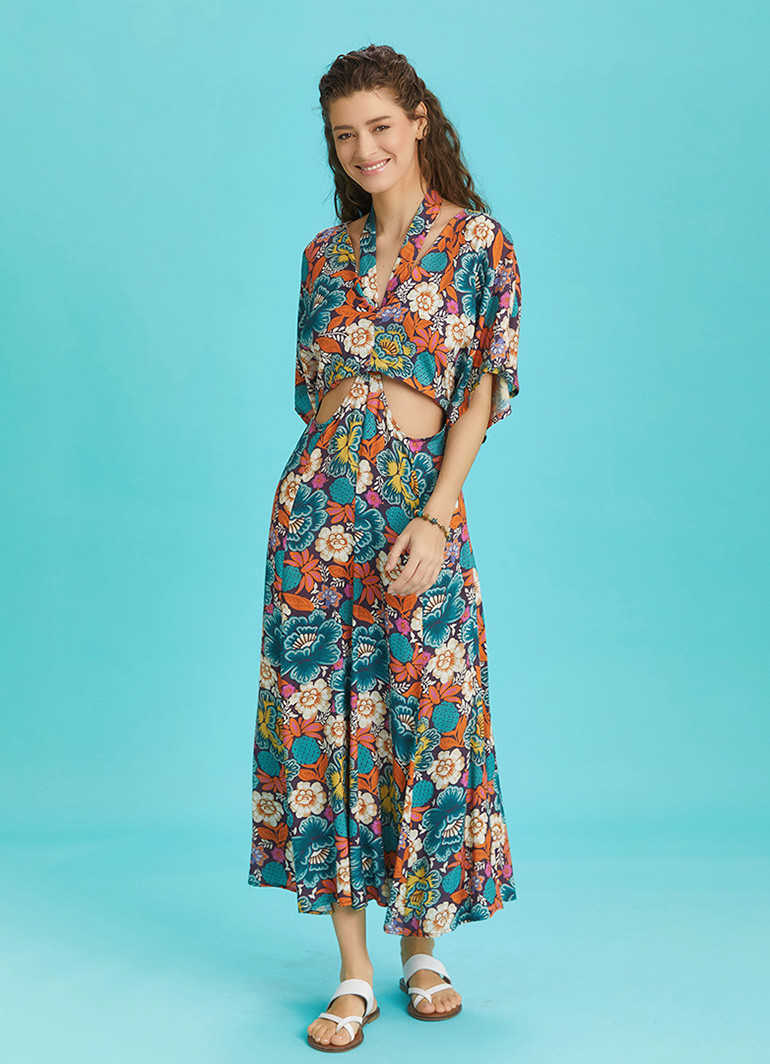 Sırt Pencereli Çiçek Desenli Cut Out Bohem Elbise 6473