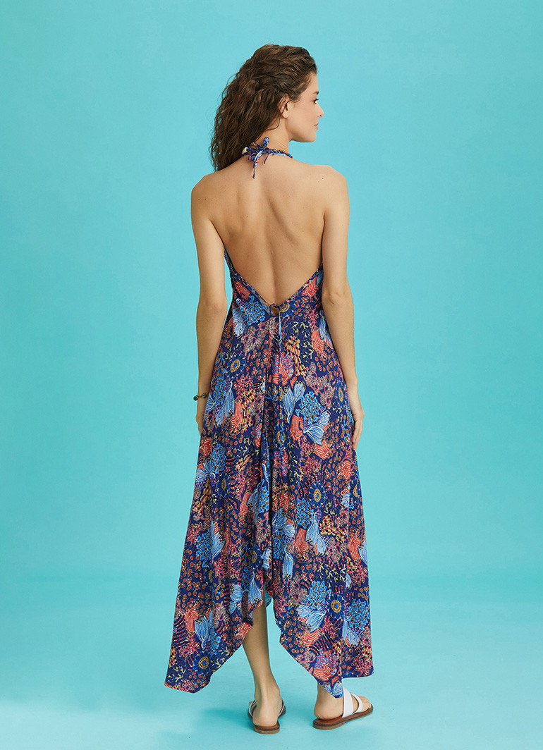 Sırtı Açık Mavi Desenli Elbise 6375