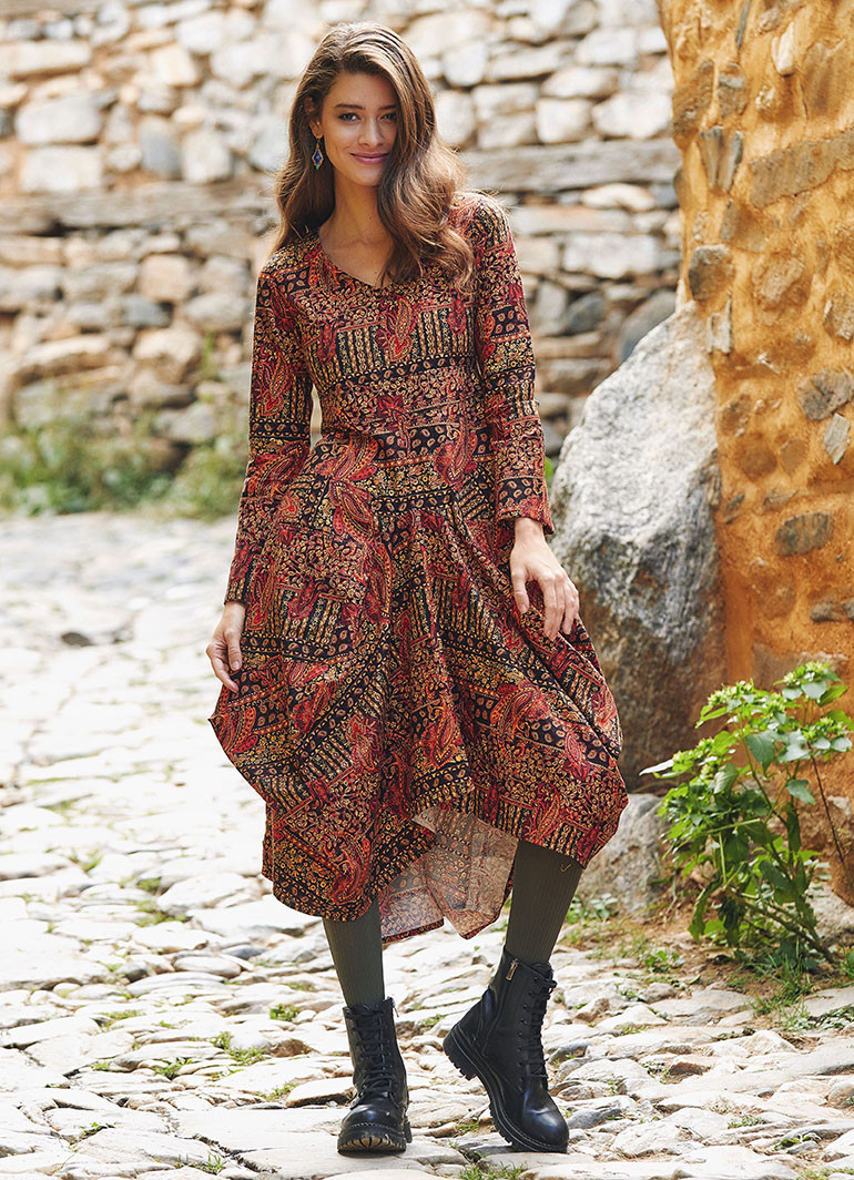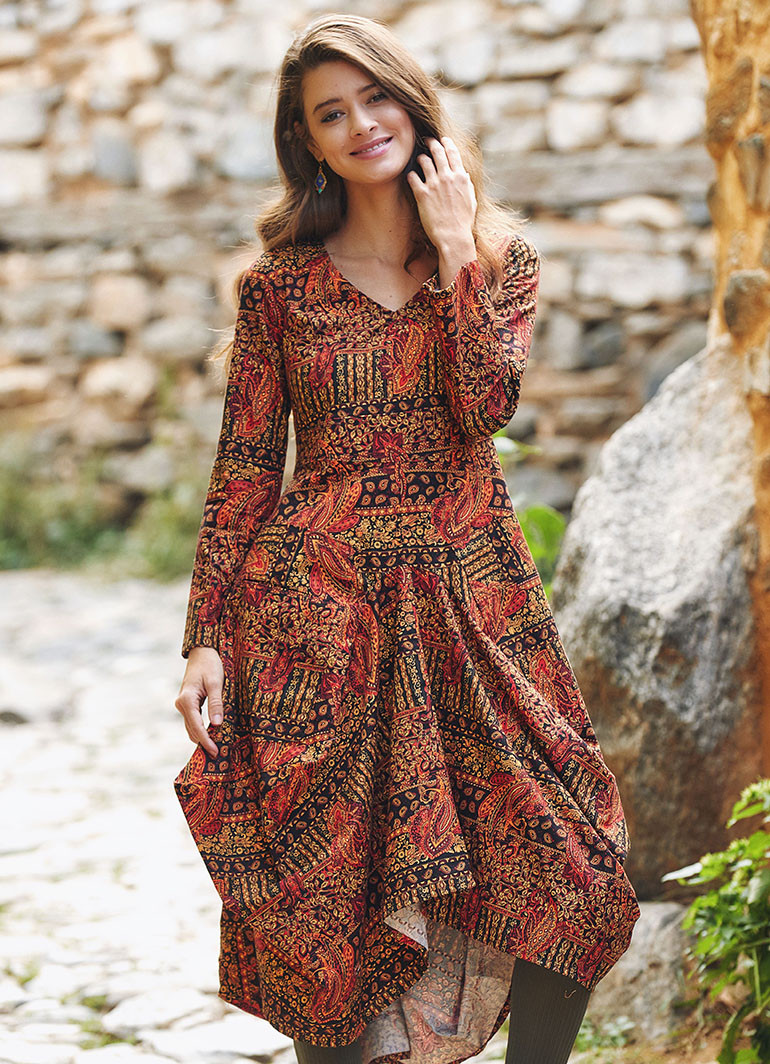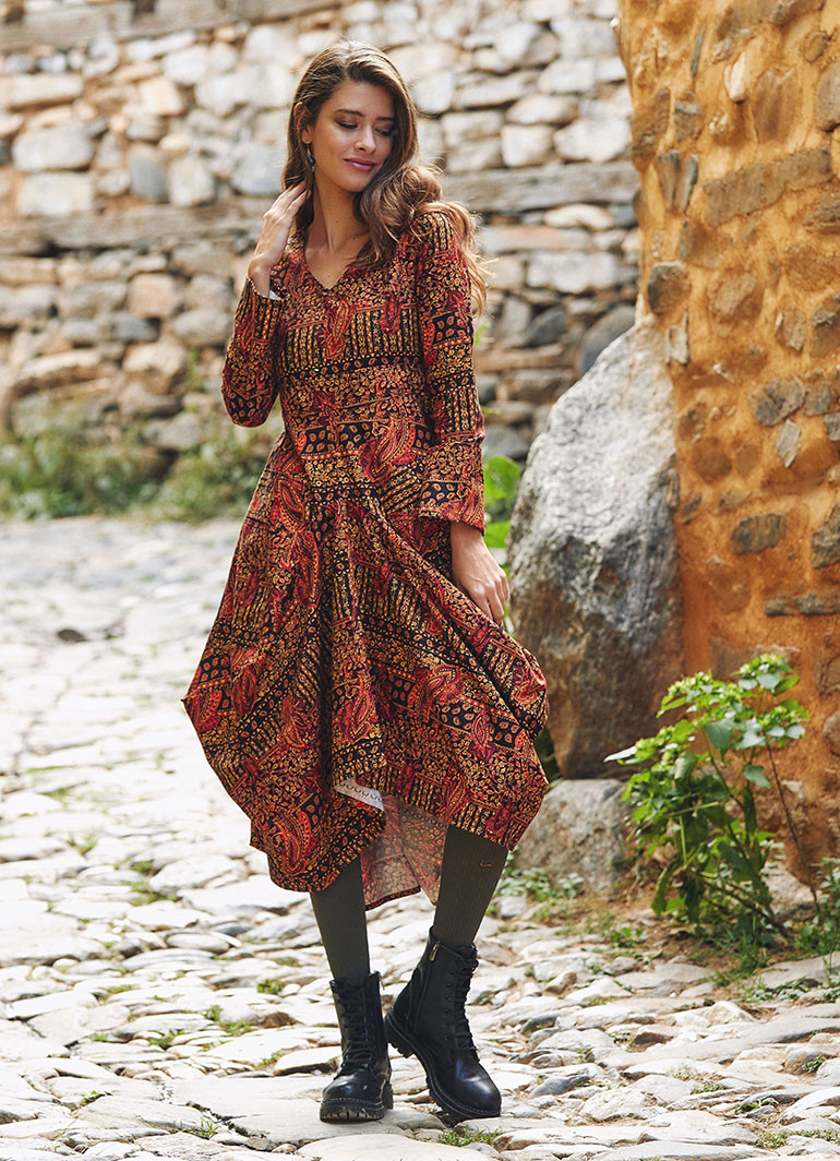 Şık, V Yaka, Balon Etek Detaylı, Desenli Elbise