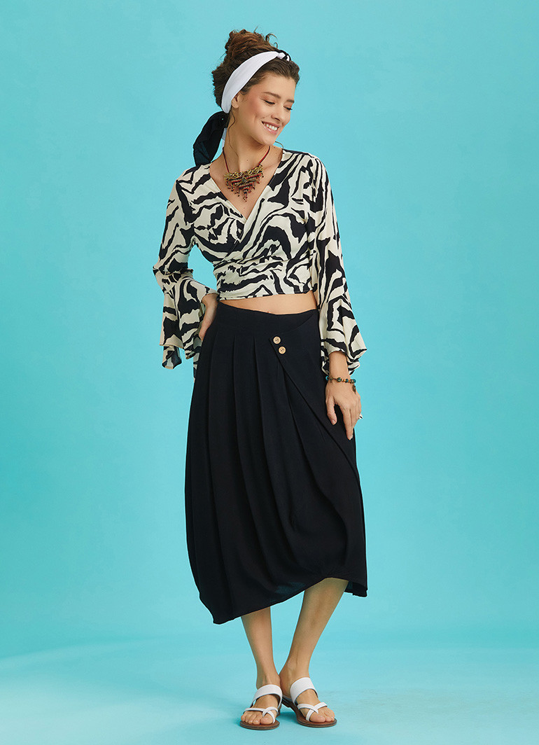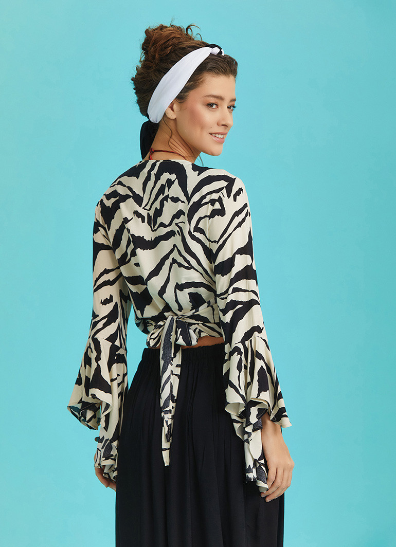 Volanlı Kol Ucu Detaylı, Bağlamalı, Kruvaze Yaka, Uzun Kollu Crop Bluz