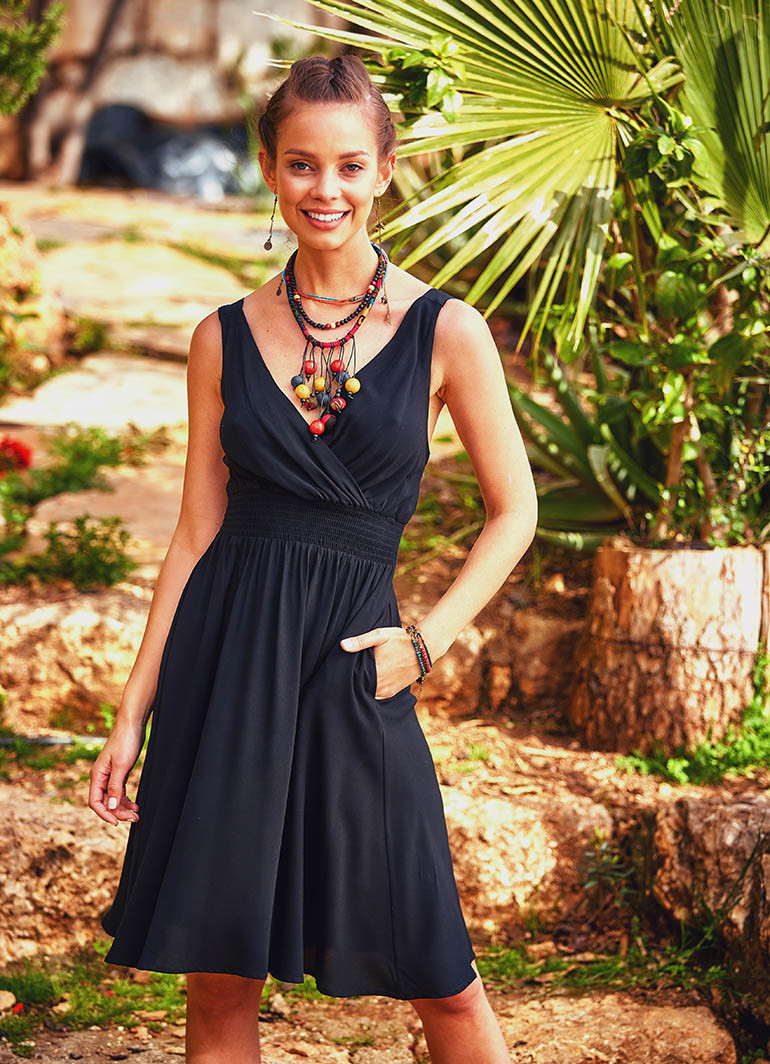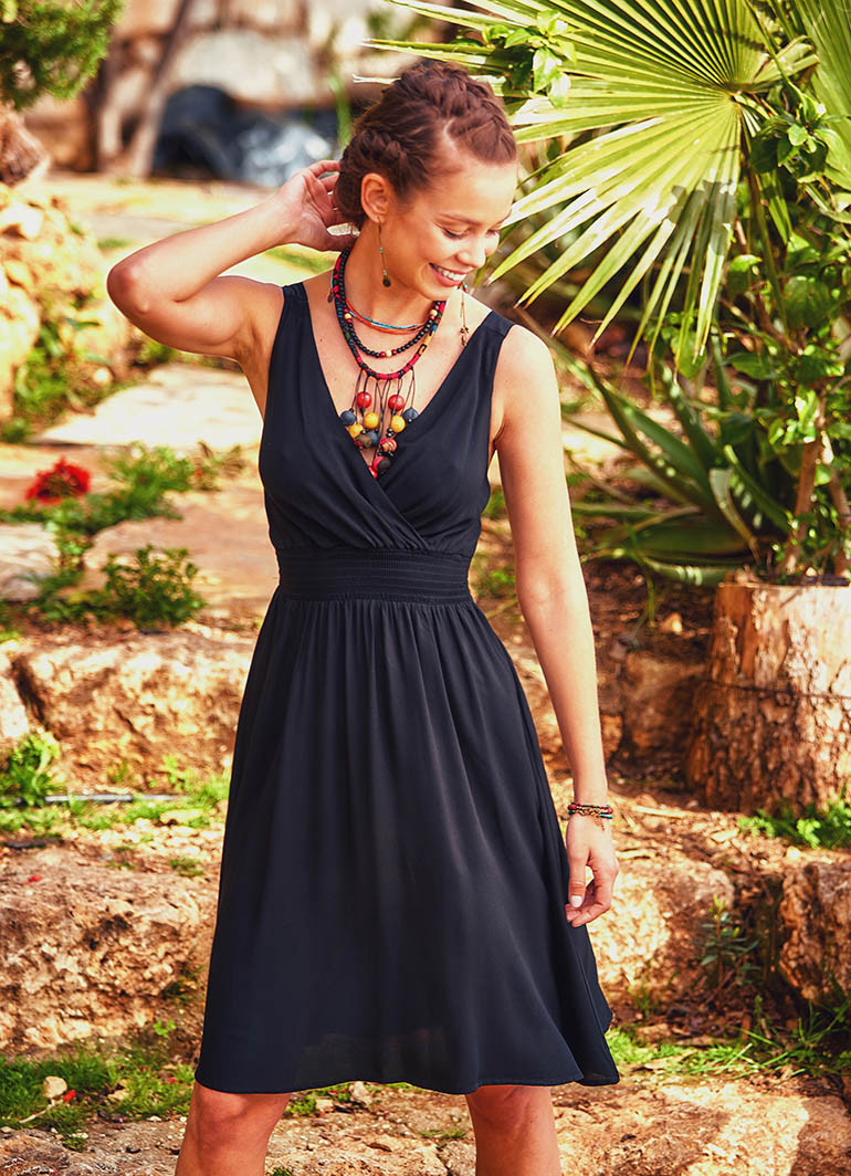 Siyah Bohem Günlük Kısa Askılı Otantik Elbise 354, zarif kruvaze V yaka kesimi ve bohem ruhunu yansıtan detaylarıyla yaz aylarının vazgeçilmezi olacak. Günlük şıklığı, doğal kumaş konforuyla birleştiren bu elbise; kalın askılı, kloş kesimi ve bele oturan gipe detayları sayesinde hem rahat hem de feminen bir duruş sunar.