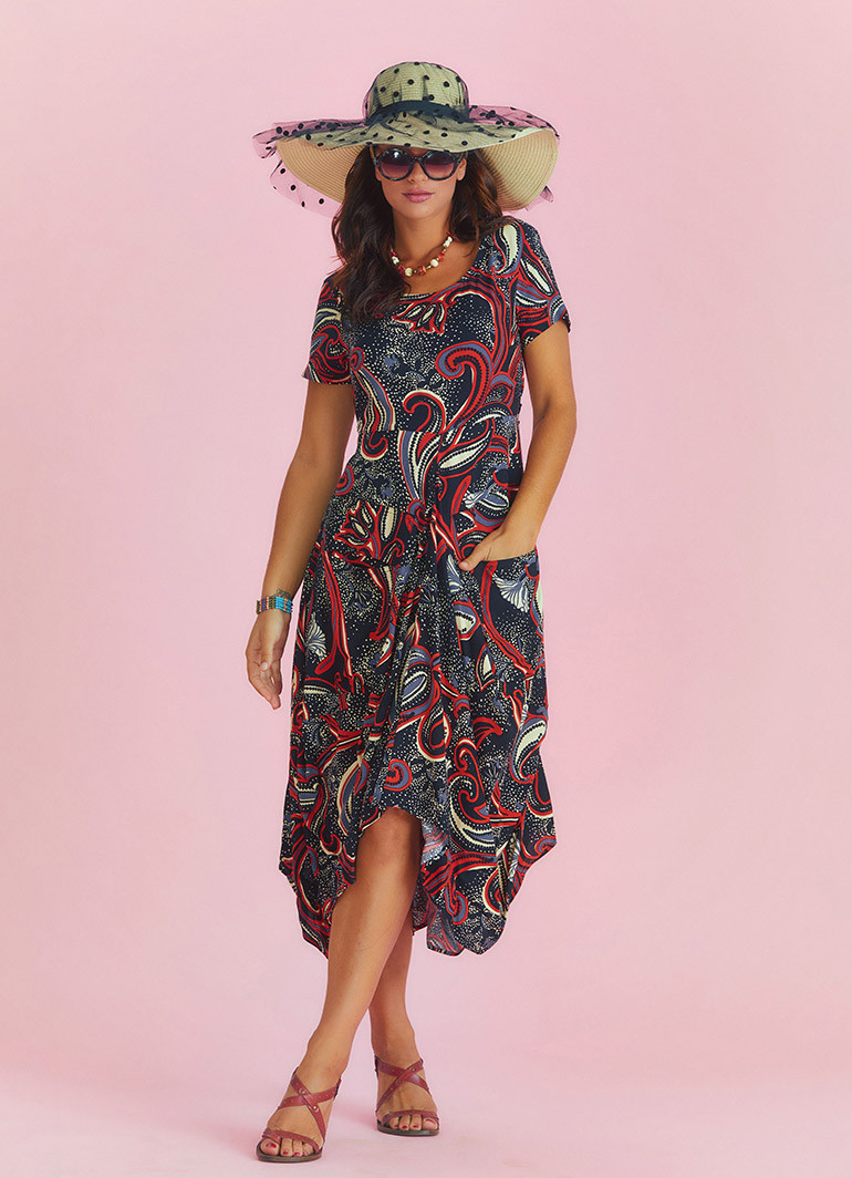Asimetrik Etek Ucu ve Ön Cep Detaylı, Beli Bağcıklı, Yarım Kollu, Kadın, Kayık Yaka Elbise