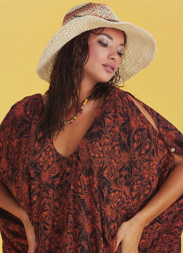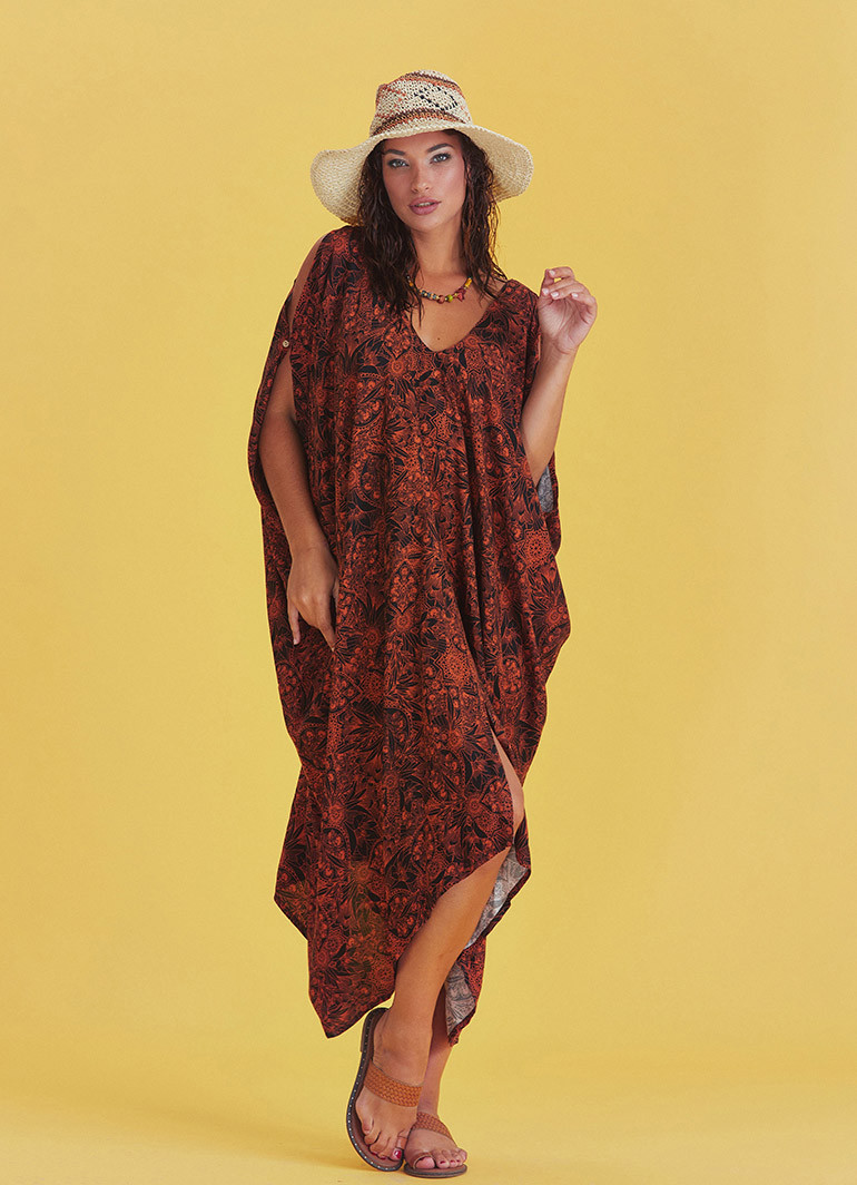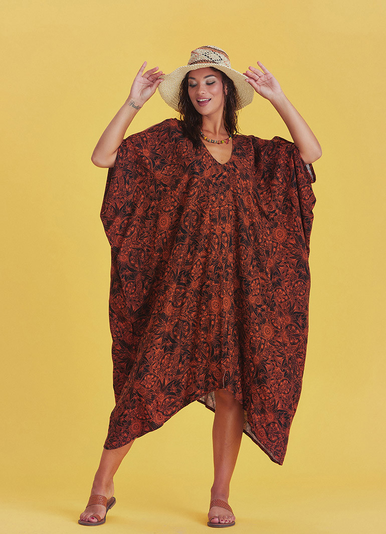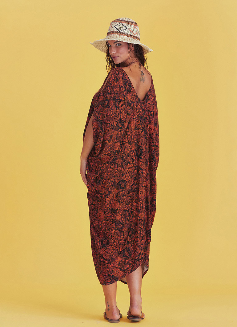 Turuncu Desenli Sırt Dekolteli Bohem Yazlık Elbise 4980