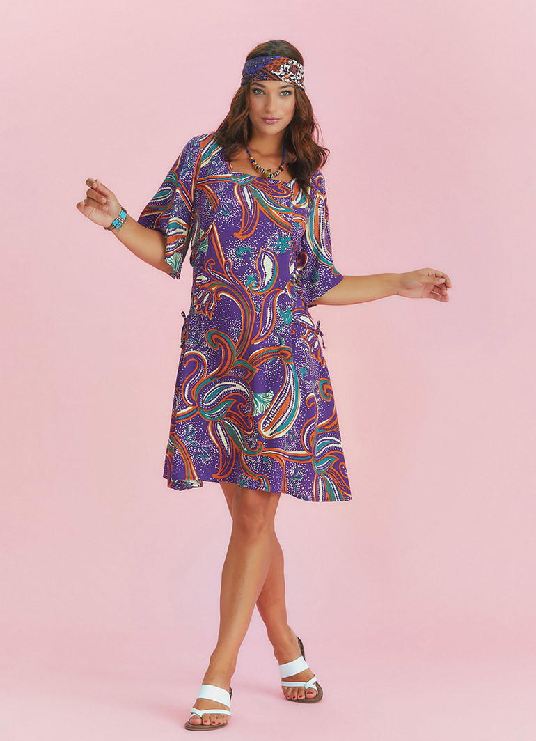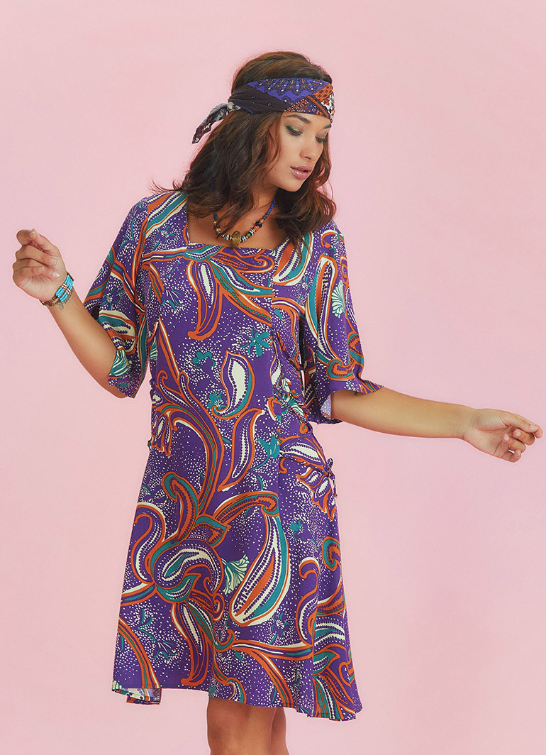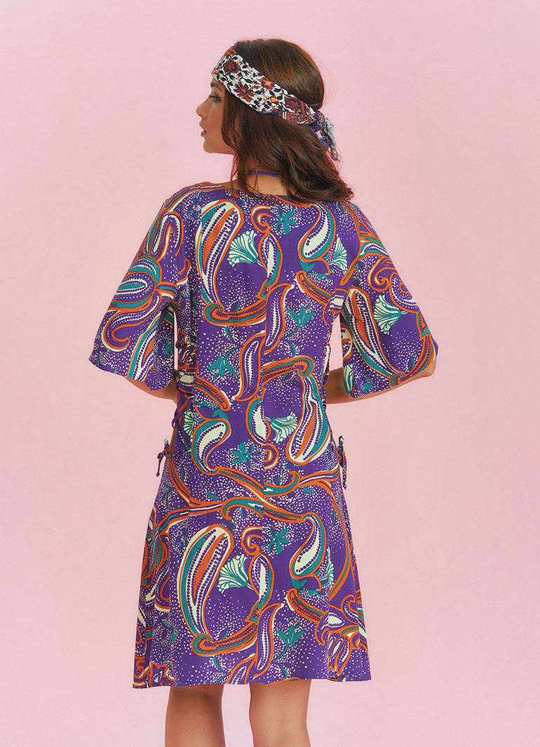 Yandan Bağlamalı Kare Yaka Mor Desenli Elbise 6575