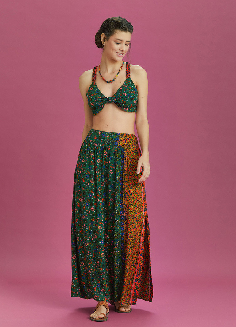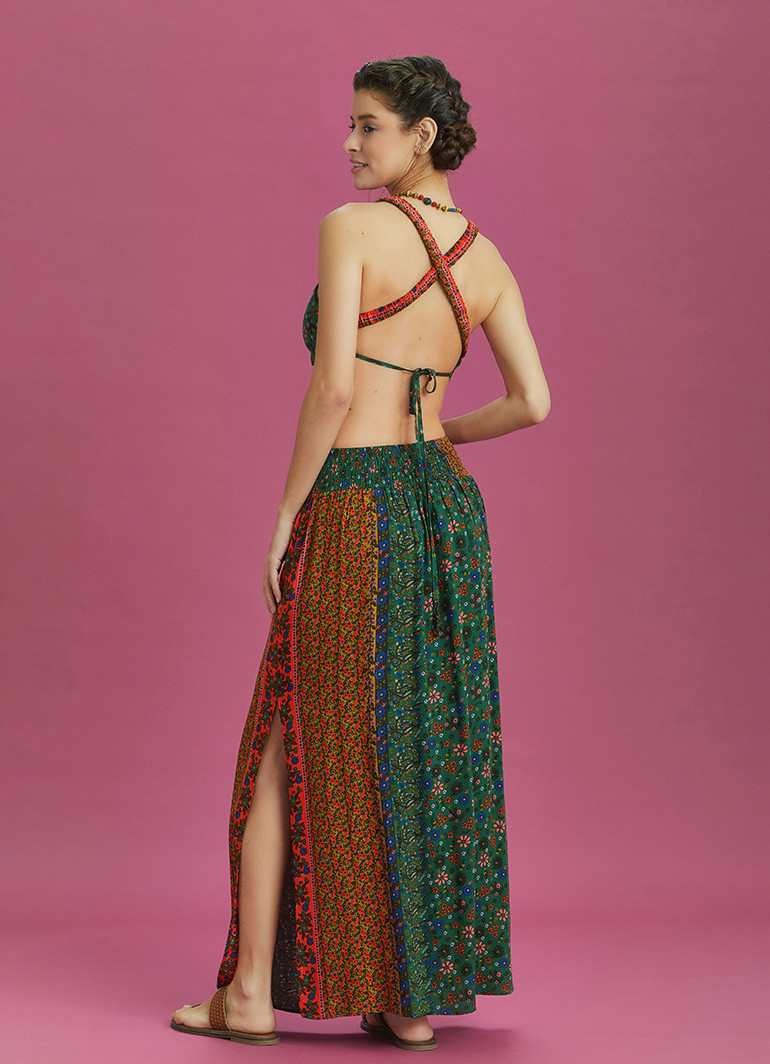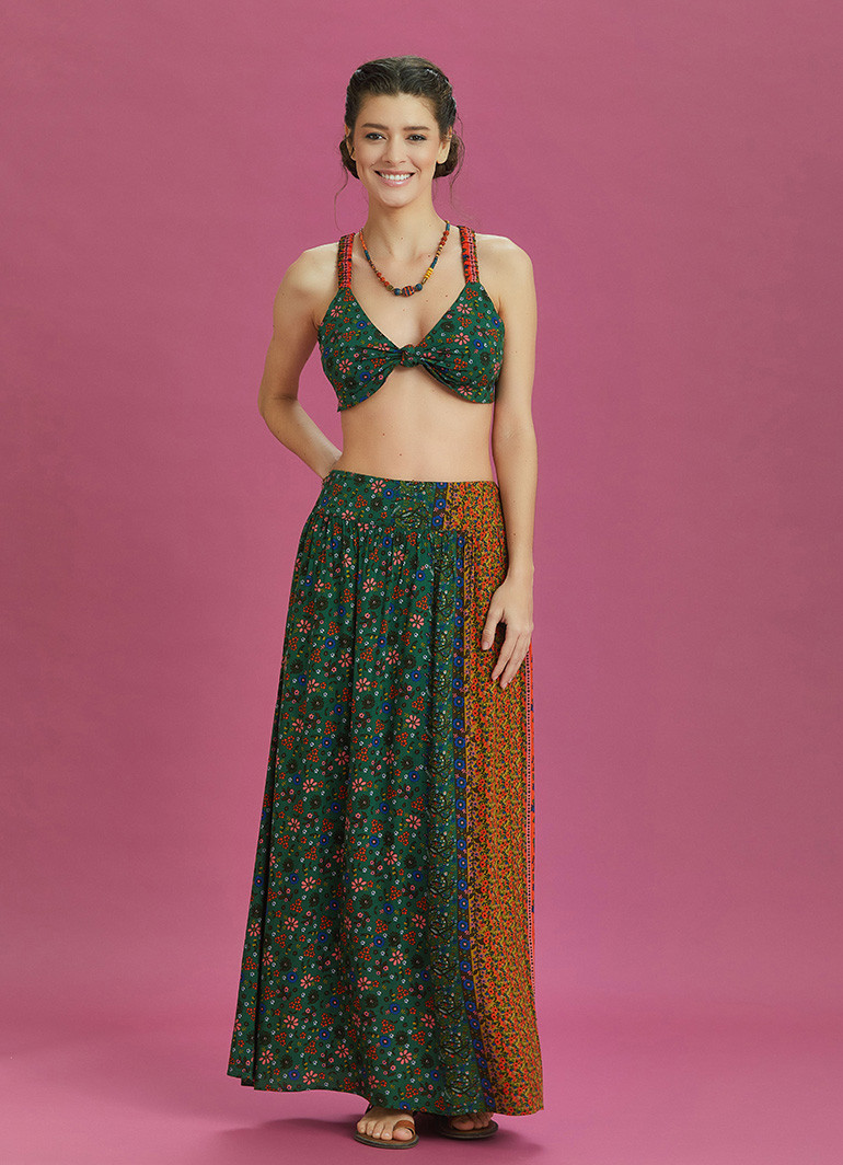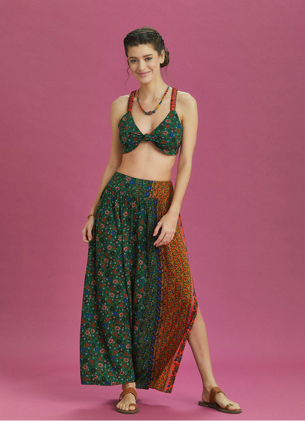 Arka Bel Gipe Lastikli, Derin Yan Yırtmaç Detaylı, Çiçekli Uzun Etek