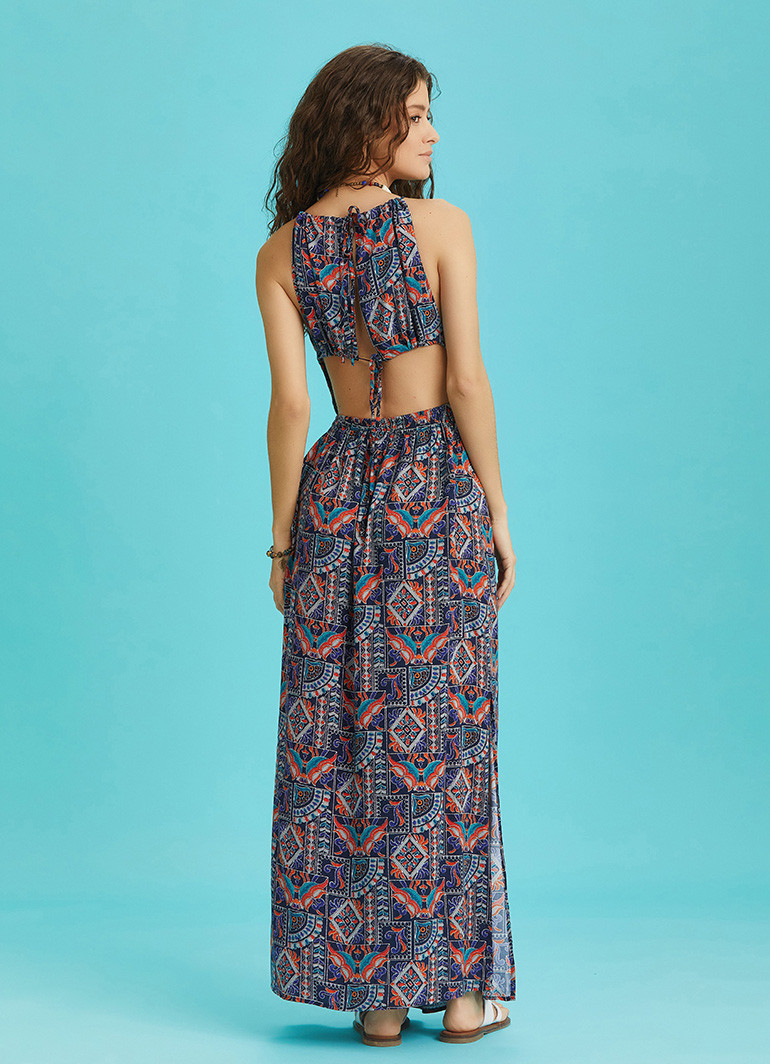 Desenli Yırtmaçlı Boyundan Bağlamalı Halter Yaka Elbise 6347